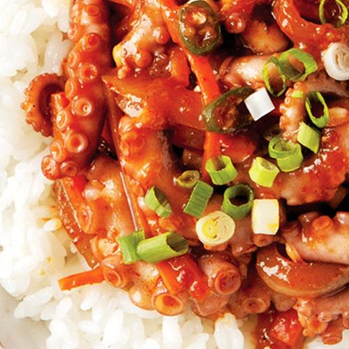 Bite sized octopus pieces stir fried with onion, garlic and bell peppers in a spicy sweet sauce. Served with steamed rice.