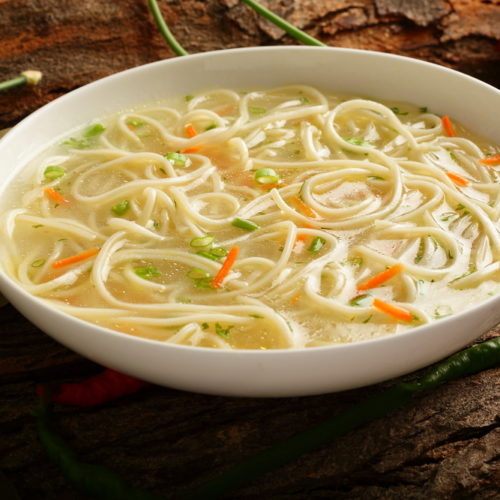Maldivian styled spicy and tangy noodles soup with eggs and vegetables.